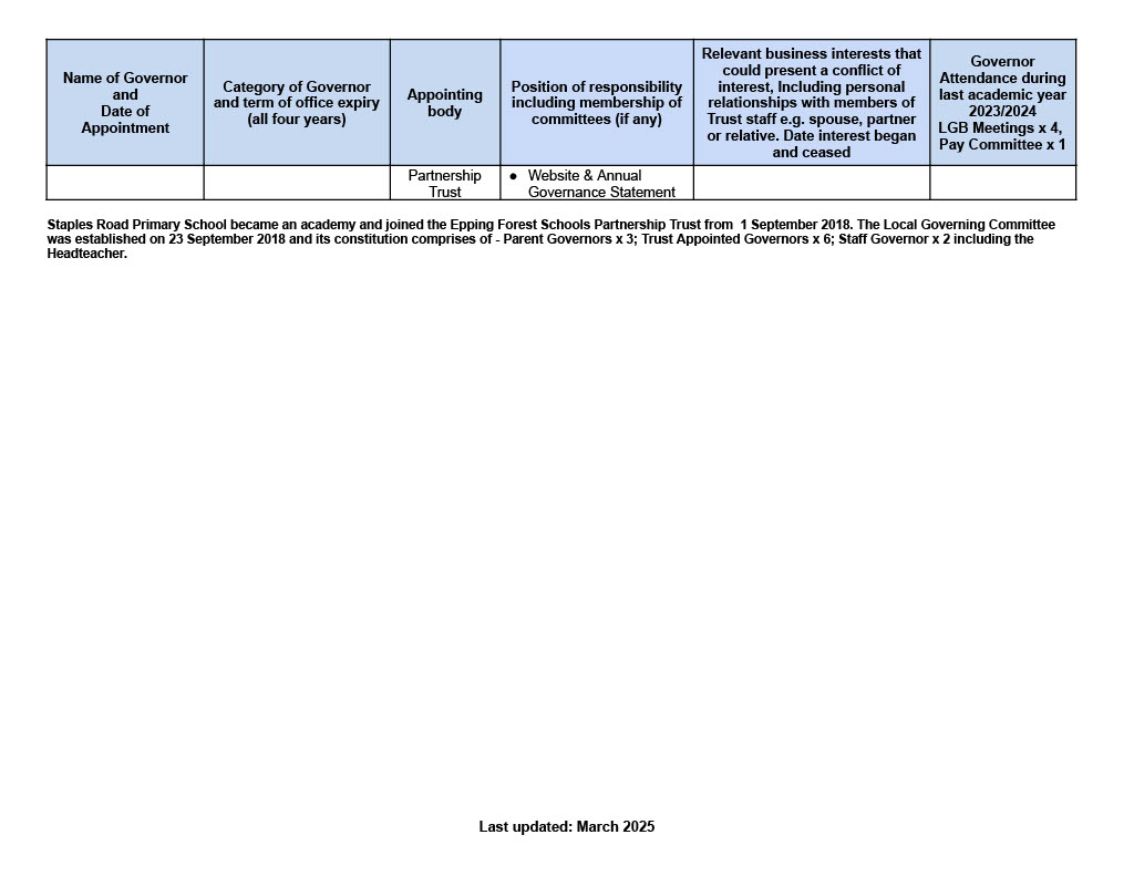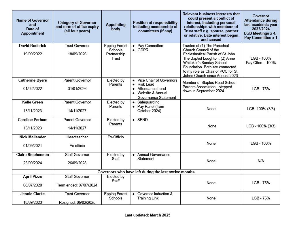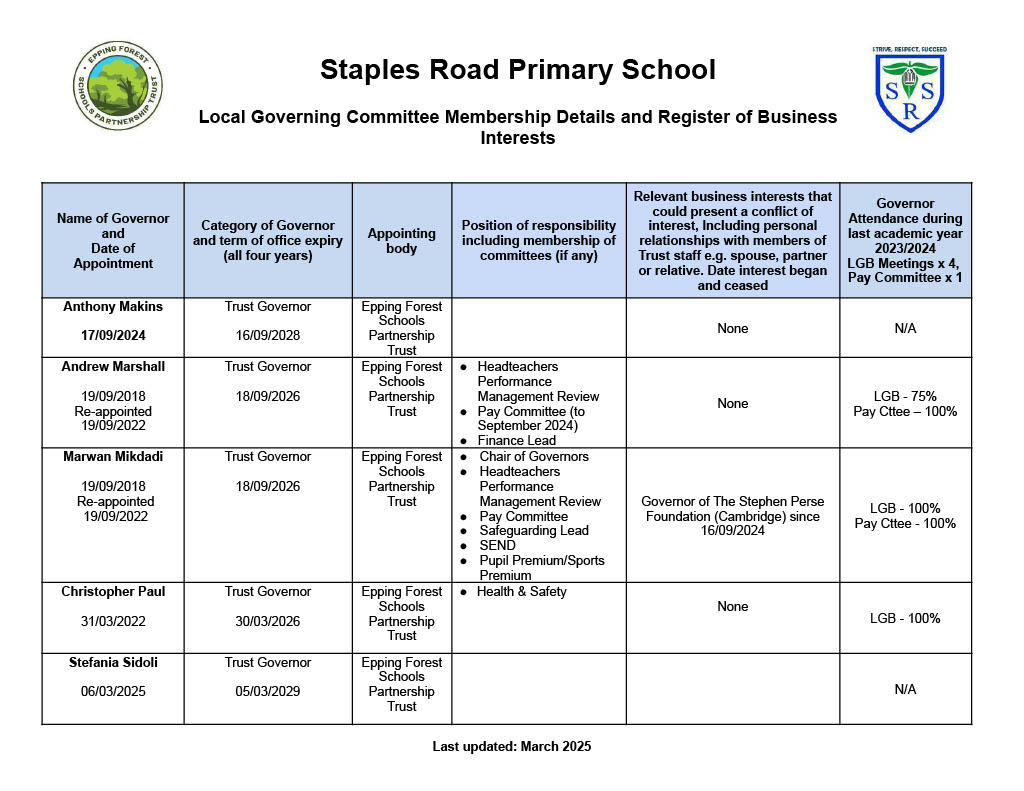 The Local Governing Committee (LGC) at Staples Road Primary School comprises of parents, staff and members of the community. We have volunteered to support the whole School Community through monitoring and evaluating the strategic direction of the School and the provision for our children and in being a 'critical friend' to all staff. See the document 'What does a Governing Body do?' below for more details.